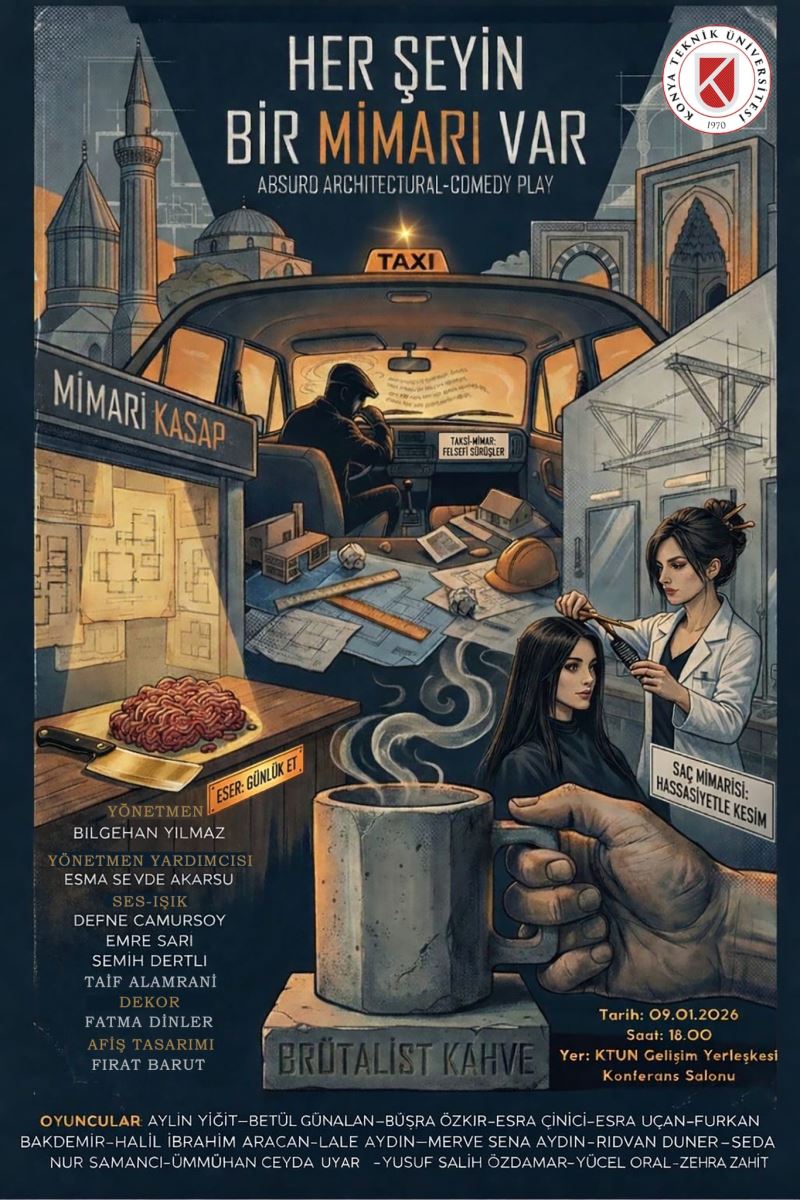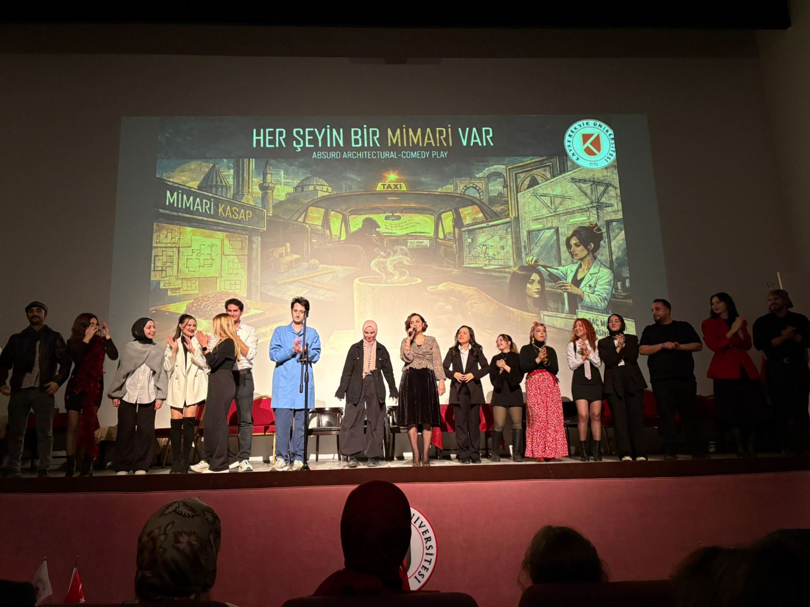Tiyatro Sahnesinde Mimarlık dersi kapsamında Prof. Dr. Bilgehan Yılmaz hocamızın yürütücülüğünde her yıl gerçekleştirilen tiyatro gösterisi, bu yıl "Her Şeyin Bir Mimarı Var" adıyla gerçekleştirilmiştir. Mimarlık mesleğine ilişkin eleştirel ve düşündürücü mesajları mizahi bir anlatımla harmanlayan bu gösterinin gerçekleştirilmesinde emeği geçen hocamıza, etkinliğe katkı sunan öğrencilerimize ve katılımlarıyla programı zenginleştiren değerli izleyicilerimize teşekkür ederiz.