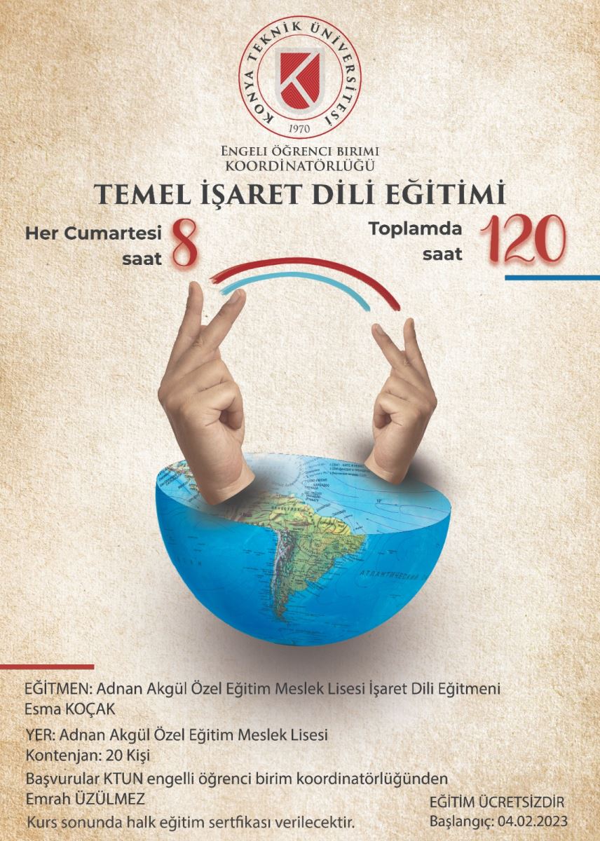 Eğitmeni Esma KOÇAK tarafından düzenlenecek olan işaret dili kursu 120 saatlik bir kurstur. sonunda Halk eğitim merkezinden katılım sertifikası verilecektir. Tüm akademik, idari personel ve öğrencilerimize açıktır.