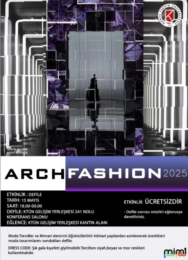 Moda Trendler ve Mimari dersi kapsamında ögrencilerin mimari yapılardan ilham alarak tasarladığı özel koleksiyonlarla düzenlenecek olan ARCHFASHION2025 defilesi 15 Mayıs 2025 tarihinde saat 18.00-00.00 arasında KTUN Gelişim Yerleşkesi 241 Numaralı Konferasn Salonunda gerçekleştirelecektir. Etkinlik ücretsizdir.