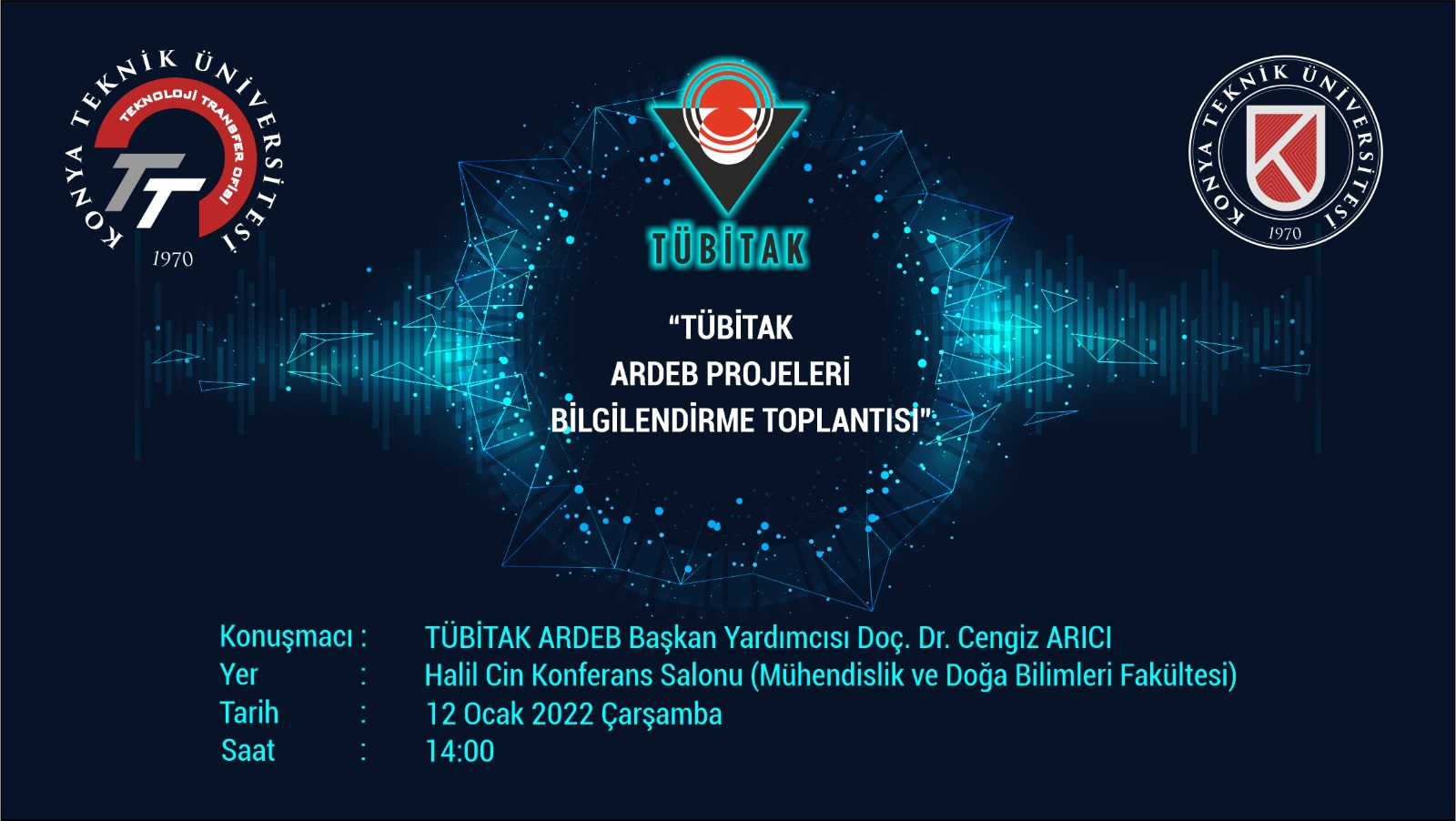 Konya Teknik Üniversitesi Teknoloji Transfer Ofisimiz (TTO) ve TÜBİTAK ortaklığı ile Mühendislik ve Doğa Bilimleri Fakültesi Halil Cin Konferans Salonunda, TÜBİTAK ARDEB Başkan Yardımcısı Doç. Dr. Doç. Dr. Cengiz Arici’nın konuşmacı olarak bulunacağı “ARDEB Projeleri Bilgilendirme Toplantısı” programı düzenlenecektir. Eğitime tüm akademik personelimiz ve öğrencilerimiz davetlidir.