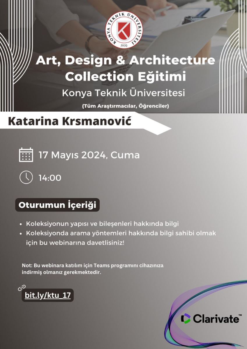 Başkanlığımızca sunduğumuz hizmetler kapsamında 2024 yılı için abonelik gerçekleştirdiğimiz Art, Design & Architecture Collection Veri Tabanı kullanımına yönelik firma yetkilisi tarafından webinar düzenlenecektir.