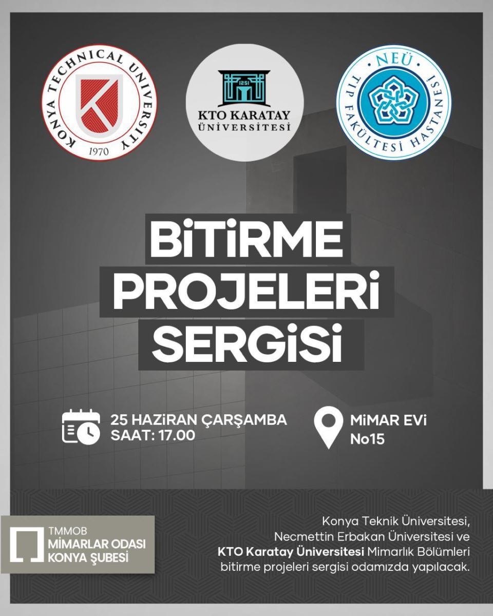 Konya Teknik Üniversitesi, Necmettin Erbakan Üniversitesi ve KTO Karatay Üniversitesi Mimarlık Bölümleri’nin ortaklaşa düzenlediği Bitirme Projeleri Sergisi, TMMOB Mimarlar Odası Konya Şubesi ev sahipliğinde gerçekleştirilecektir. Mimarlık eğitimini başarıyla tamamlayan öğrencilerimizin projelerinin kamuoyuyla paylaşılacağı bu etkinlikte, farklı üniversitelerden öğrencilerin özgün yaklaşımları ve tasarım vizyonları bir araya gelecektir.