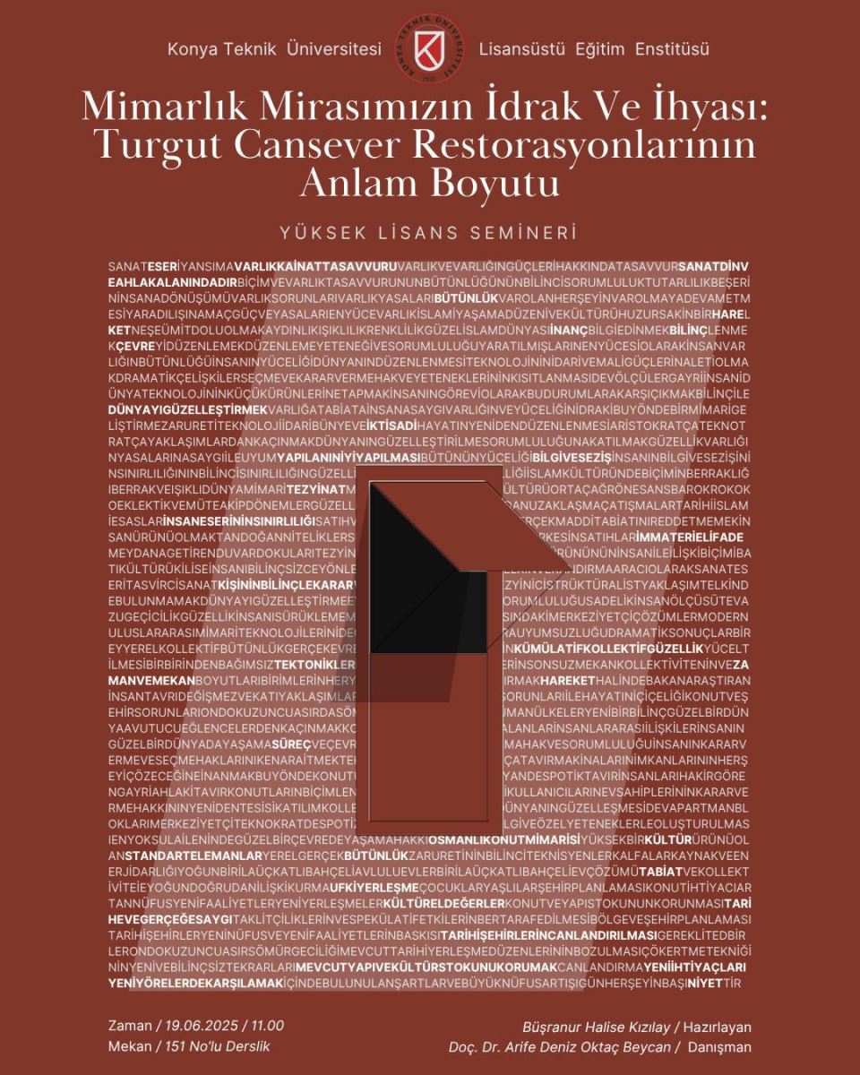 Doç.Dr. Deniz OKTAÇ BEYCAN hocamızın lisansüstü öğrencisi Büşranur Halise Kızılay’ın yüksek lisans seminer sunumu 19 Haziran perşembe günü saat 11.00’de 151 nolu sınıfta gerçekleştirilecektir. KTÜN Mimarlık