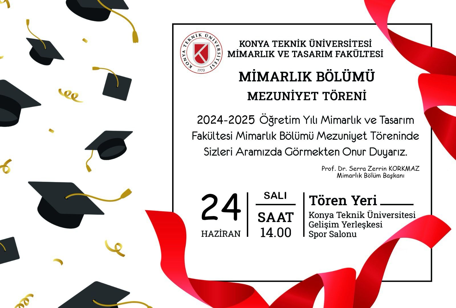 2024-2025 Öğretim Yılı Mimarlık ve Tasarım Fakültesi Mimarlık Bölümü Mezuniyet Töreninde sizleri aramızda görmekten onur duyarız. Tören 25 Haziran 2025 saat 14.00'te Gelişim Yerleşkesi Spor Salonunda gerçekleşecektir. KTÜN Mimarlık