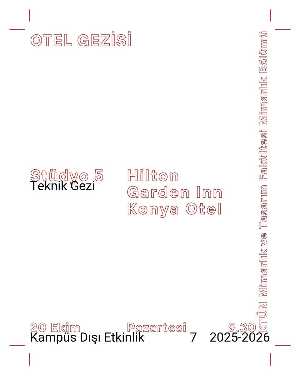 Prof. Dr. Fatih Canan, Doç. Dr. Mustafa Korumaz, Y. Mimar Şefikanur Turan yürütücülüğünde bölümümüz 3.sınıf öğrencileri ile birlikte Stüdyo 5 dersi kapsamında Hilton Garden Inn Konya Oteli'ne teknik gezi düzenlenmiştir.