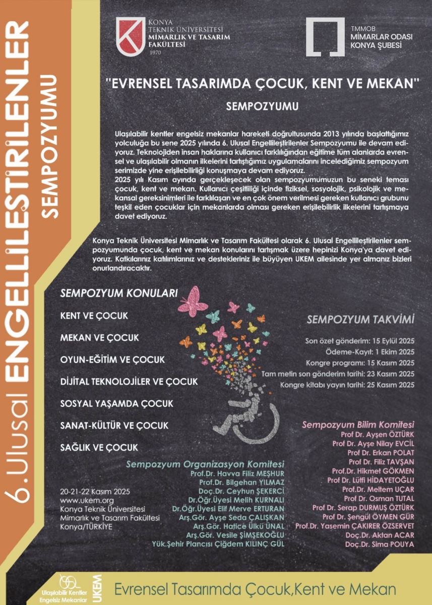“Evrensel Tasarımda Çocuk, Kent ve Mekân” temalı UKEM 2025 – 6. Ulusal Engellileştirilenler Sempozyumu, Konya Teknik Üniversitesi Mimarlık ve Tasarım Fakültesi yürütücülüğünde ve TMMOB Mimarlar Odası Konya Şubesi iş birliğinde 20–21–22 Kasım 2025 tarihlerinde gerçekleştirilecektir. Sempozyum; mimarlık, şehir ve bölge planlama iç mimarlık ve endüstri ürünleri tasarımı  gibi disiplinlerde çalışan araştırmacı ve uygulayıcıları; çocukların kent ve mekân deneyimi çerçevesinde evrensel tasarım ilkeleri üzerine düşünmeye ve tartışmaya davet etmektedir. Detaylı bilgi ve başvuru süreci için resmi duyurular web sayfasından takip edilebilir
