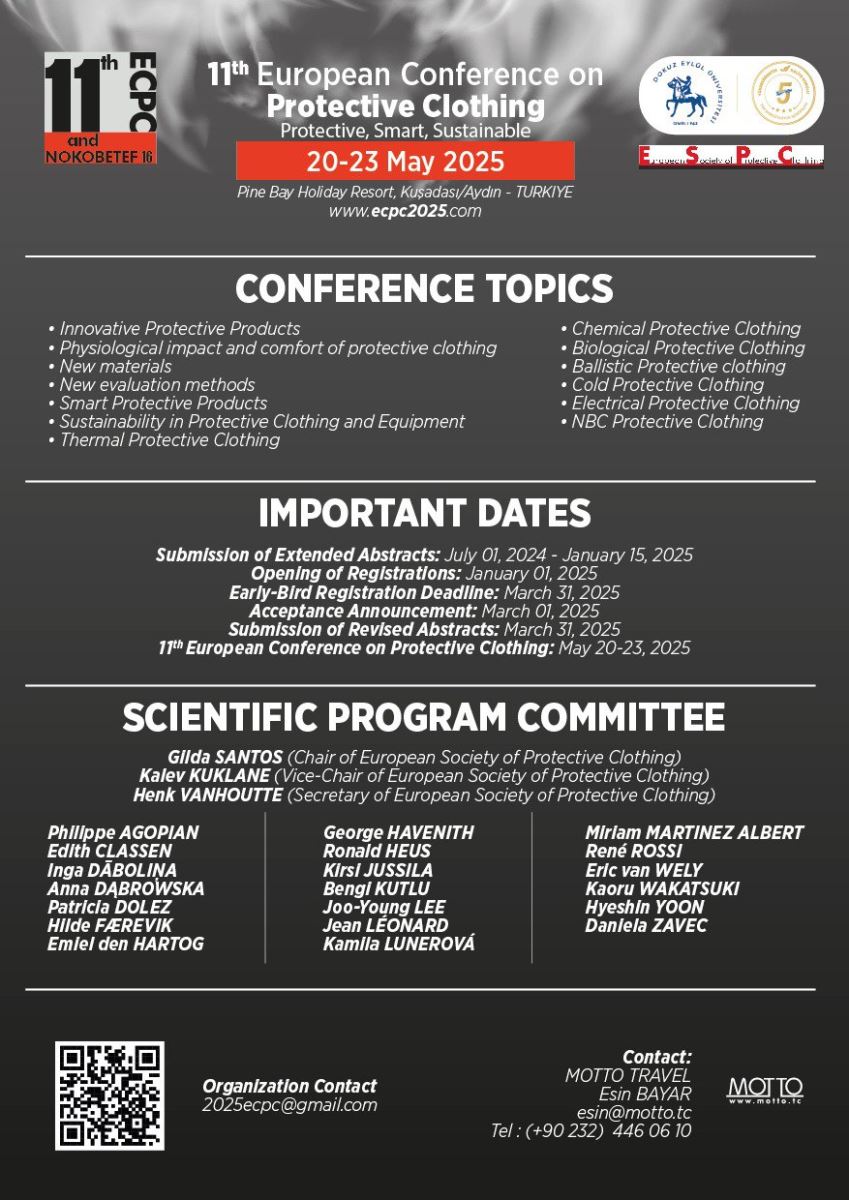 Dokuz Eylül Üniversitesi Mühendislik Fakültesi Tekstil Mühendisliği Bölümümüz ve Avrupa Koruyucu Giysiler Birliği (ESPC) tarafından 11. Avrupa Koruyucu Giysiler Konferansı (ECPC) düzenlenecektir. ESPC üyesi ülkeler tarafından 2020 yılından bu yana her iki-üç yılda bir düzenlenen Koruyucu Giysiler Konferansı serisinin amacı, kişisel koruma alanında araştırmaları ve iş birliğini teşvik etmektir. Koruyucu giysi sektöründen araştırmacıları, tasarımcıları, üreticileri, sağlık ve güvenlik uzmanlarını, son kullanıcılarını, kamu otoritelerini ve yasa koyucuları bir araya getiren konferans, koruyucu giysilerle ilgili fikirlerin, araştırma sonuçlarının ve proje gelişmelerinin kullanıcı koruması ve konforuna güçlü bir şekilde odaklanarak yaygınlaştırıldığı, paylaşıldığı ve tartışıldığı bir platform haline gelmiştir. "Koruyucu, Akıllı, Sürdürülebilir" teması ile Üniversitemiz ev sahipliğinde düzenlenmesi planlanan 11. Avrupa Koruyucu Giysiler Konferansı, 20-23 Mayıs 2025 tarihlerinde Kuşadası-Aydın'da Pine Bay Holiday Resort'ta gerçekleştirilecektir. Afişleri ekte yer alan Kongre hakkında detaylı bilgilere www.ecpc2025.com adresinden ulaşılabilir.