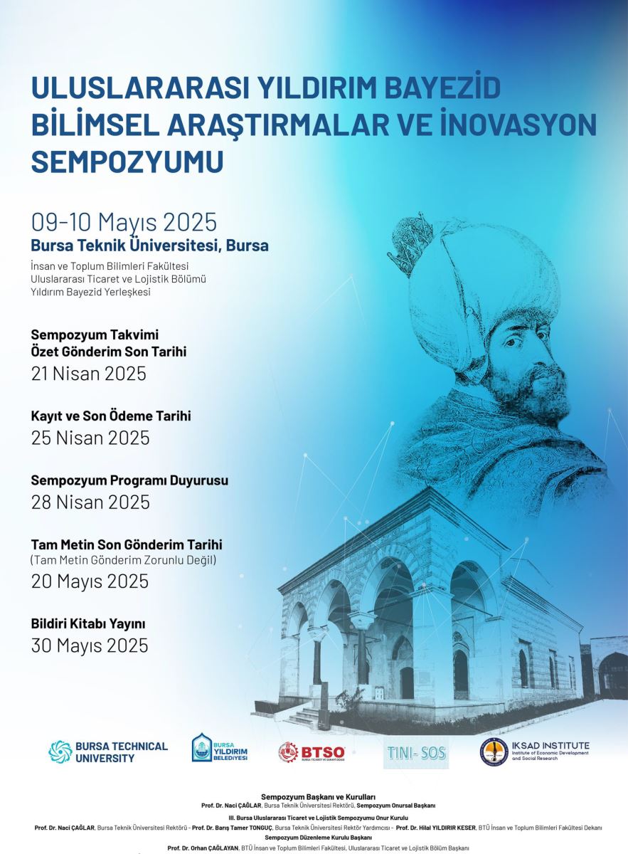 1. Uluslararası Yıldırım Bayezid Bilimsel Araştırmalar ve İnovasyon Sempozyumu 9-10 Mayıs 2025 tarihinde Üniversitemiz İnsan ve Toplum Bilimleri Fakültesi Uluslararası Ticaret ve Lojistik Bölümü akademisyenleri tarafından gerçekleştirilecektir. Sempozyum bilgilerine https://sempozyum.btu.edu.tr/1.baissempozyumu linkinden ulaşabilirsiniz.