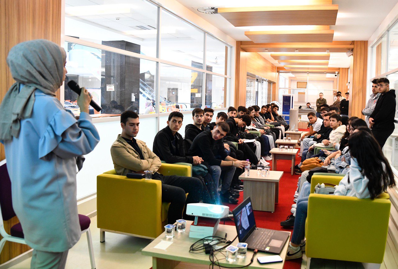 1. sınıfa başlayan öğrencilere yönelik kütüphane hizmetlerini yerinde tanıtmak amacıyla düzenlenen oryantasyon eğitiminde; video ve fotoğraflarla desteklenen sunumun ardından, öğrencilere uygulamalı olarak kütüphanedeki başta kiosklar ve diğer cihazların kullanımı yaptırıldı. Ardından kütüphane bölümleri olan alt ve üst okuma salonu ile özel çalışma odaları gezdirildi. Kitapların konularına göre raflara yerleştiriliş sistemi ve rafların konu ve harflere göre konumları anlatılarak yerinde inceleme ve gözlemler yapıldı. Öğrencilerin soruları cevaplandırılarak, kütüphane hakkında öneri, eleştiri ve görüşler alındı.