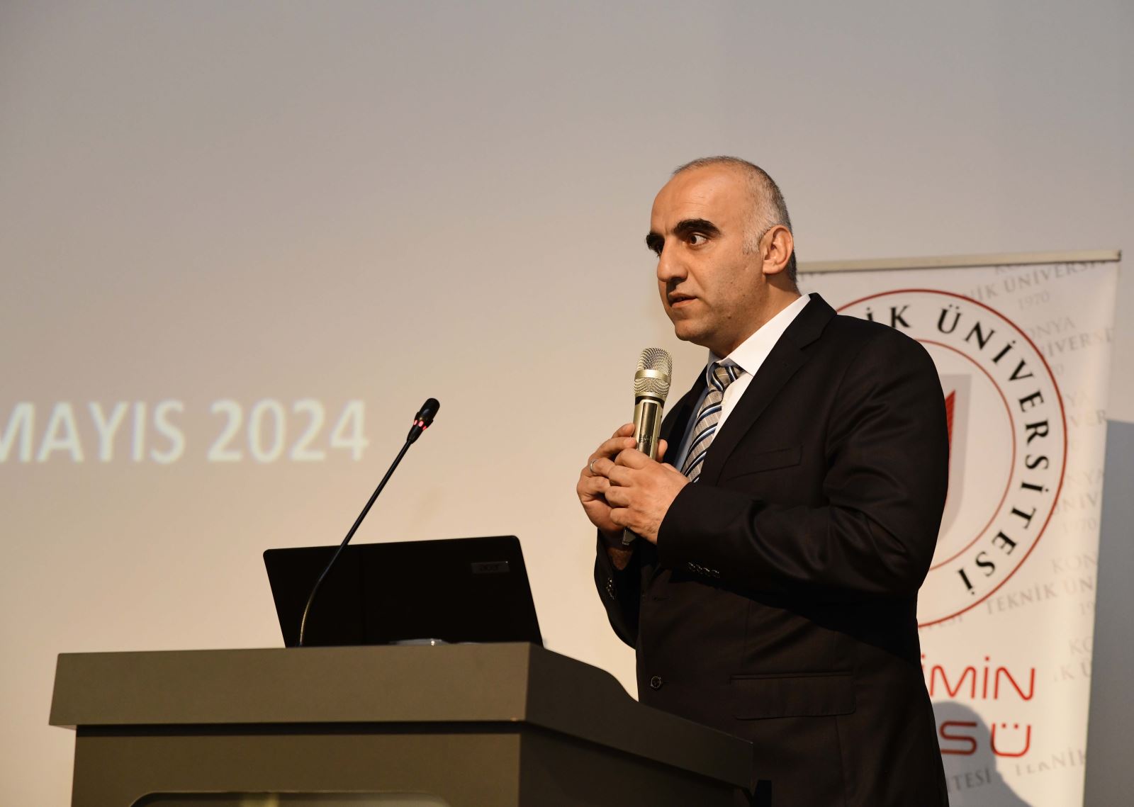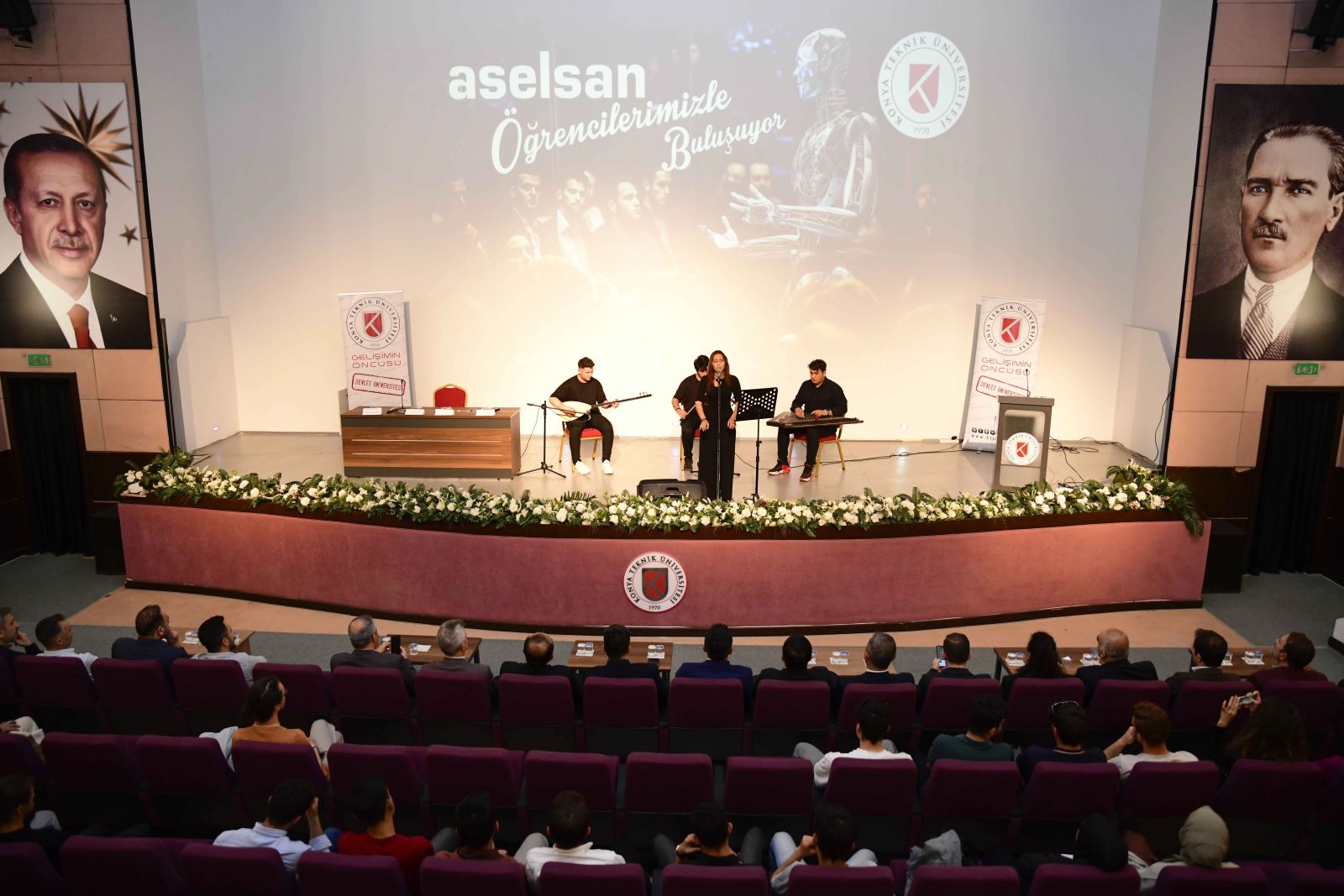 Kılıç’ın sunumunun ardından kürsüye gelen Rektörümüz Prof. Dr. Çelik, KTÜN’ün köklü geçmişine değinerek başladığı konuşmasında KTÜN bünyesinde bulunan Bilgisayar Mühendisliği Bölümünün ülkemizdeki ilk kurulan bilgisayar mühendisliği bölümlerinden biri olduğunu belirtti. Bilişim teknolojileri başta olmak üzere ülke teknolojisine KTÜN’ün büyük katkılar sağladığının altını çizen Rektörümüz Çelik, “Konya Teknik Üniversitesi olarak, Ülkemizin milli teknoloji hamlesiyle ve teknolojik hedefleriyle uyumlu, savunma sanayiine yönelik projeler geliştiriyoruz. Savunma Sanayii Müsteşarlığı’nın belirlediği öncelikli alanlarda projeler yürütüyoruz. Bu amaçla, bir taraftan araştırma ve geliştirme faaliyetlerimizi yaparken, diğer taraftan nitelikli mühendis yetiştirmek için gayret ediyoruz, Türkiye’nin en iyi mühendislerini ASELSAN bünyesinde istihdam ediyor, sizler de onlardan biri olabilirsiniz.” dedi.