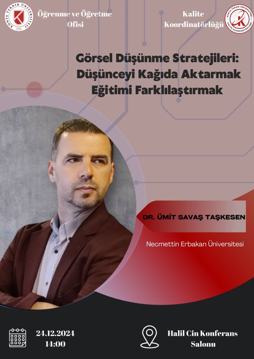 Kalite Koordinatörlüğü, Öğrenme ve Öğretme Ofisi ve Kalite Kulübü iş birliğinde 24 Aralık Salı günü saat 14:00'de Halil Cin Konferans Salonunda düzenlenecek olan "GÖRSEL DÜŞÜNME STRATEJİLERİ: DÜŞÜNMEYİ KAĞIDA AKTARMAK EĞİTİMİ FARKLILAŞTIRMAK"  isimli etkinliğe tüm öğretim elemanlarımız davetlidir.