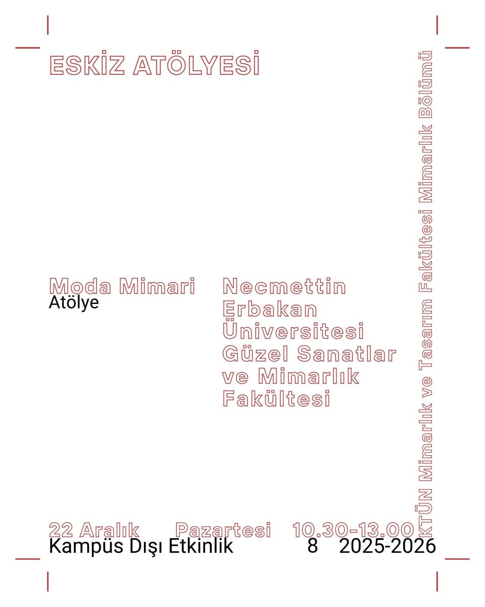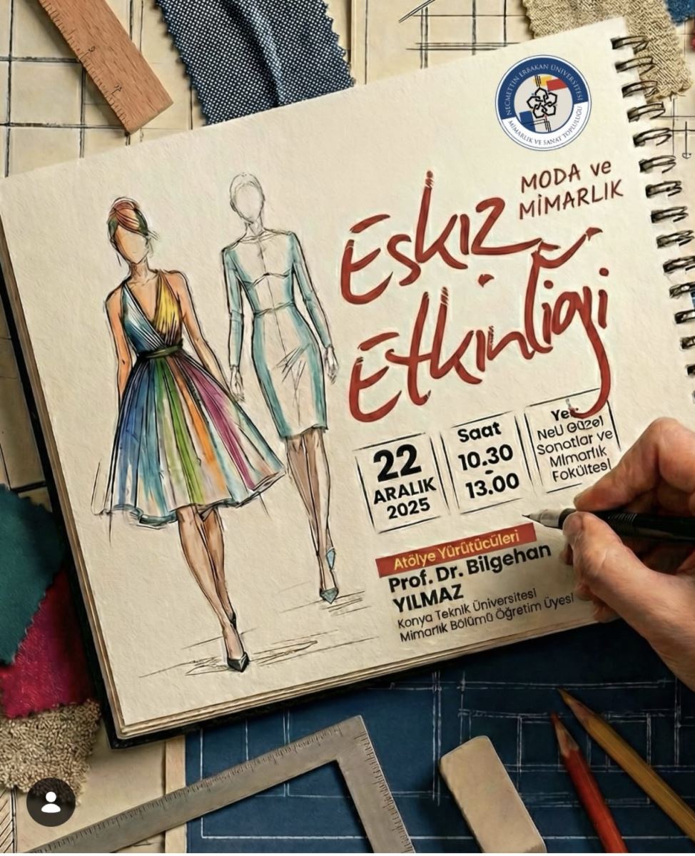 22 Aralık Pazartesi günü saat 10.30-13.00 arası gerçekleştirilen Moda ve Mimari/Eskiz Etkinliği Necmettin Erbakan Üniversitesi Güzel Sanatlar ve Mimarlık Fakültesinde Prof. Dr. Bilgehan Yılmaz hocamız tarafından gerçekleştirilmiştir. Çizgi, oran ve form ilişkisini ele alarak tasarım sürecine odaklanılan etkinlikte yaratıcı düşünme, estetik algı ve tasarım dili üzerine değerli paylaşımlar yapılmıştır