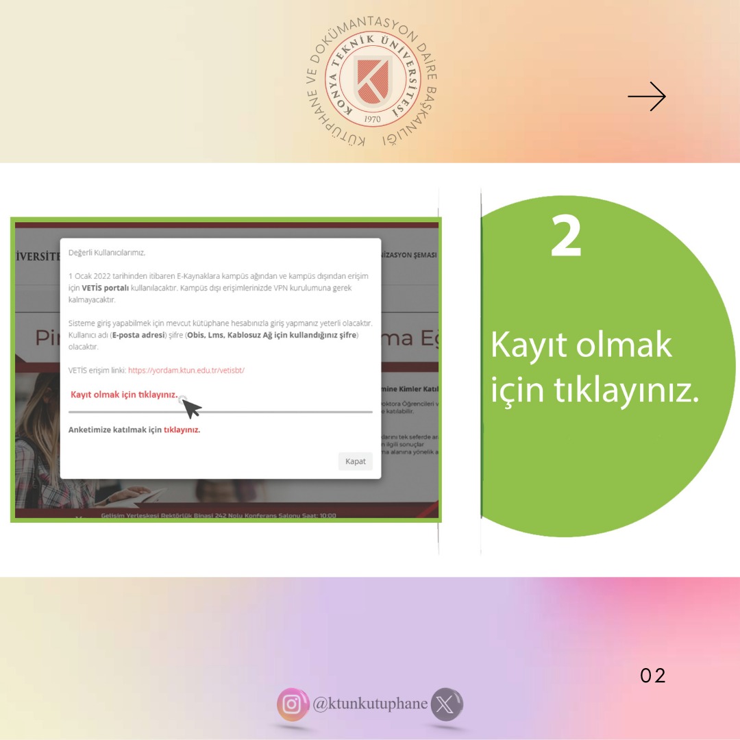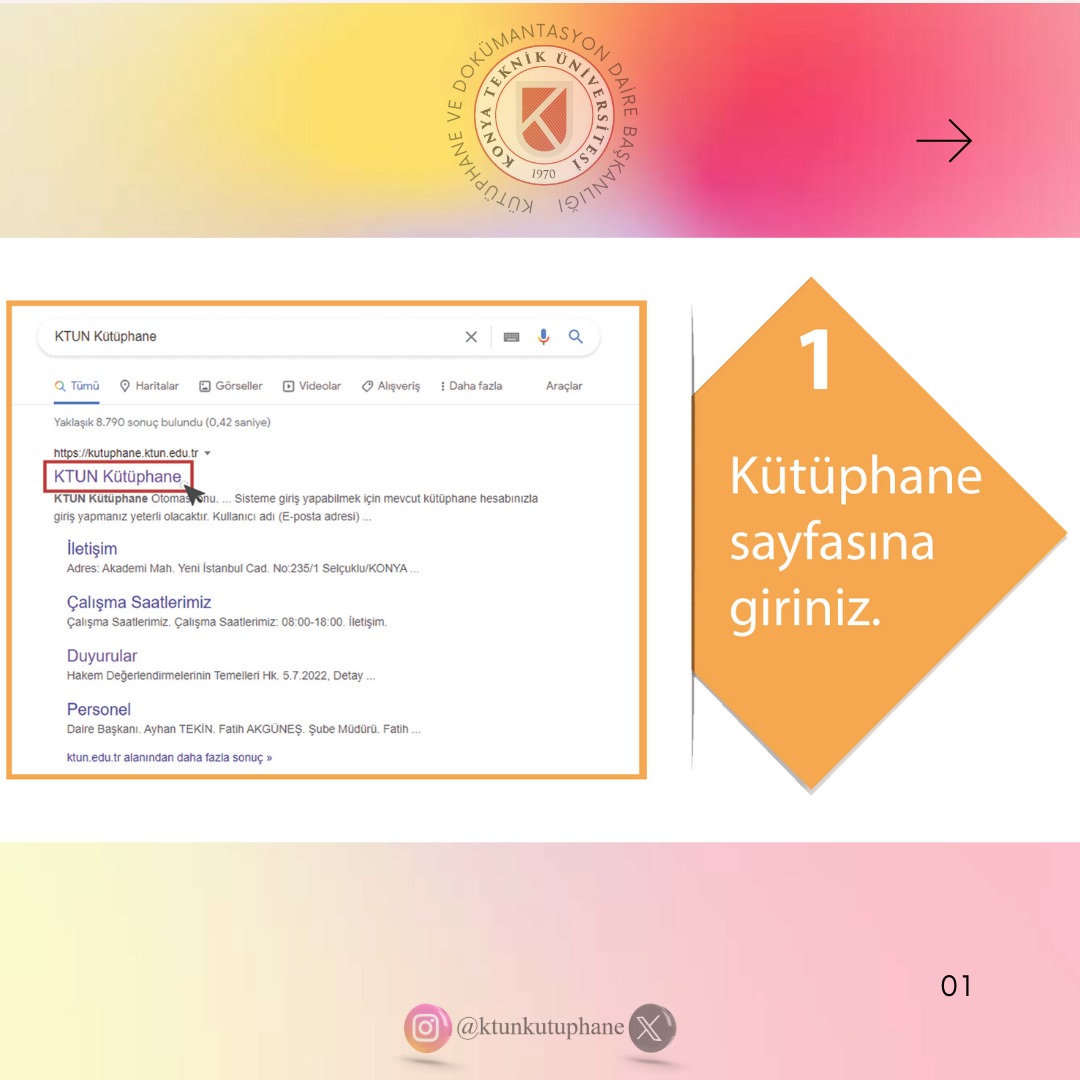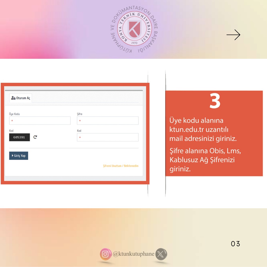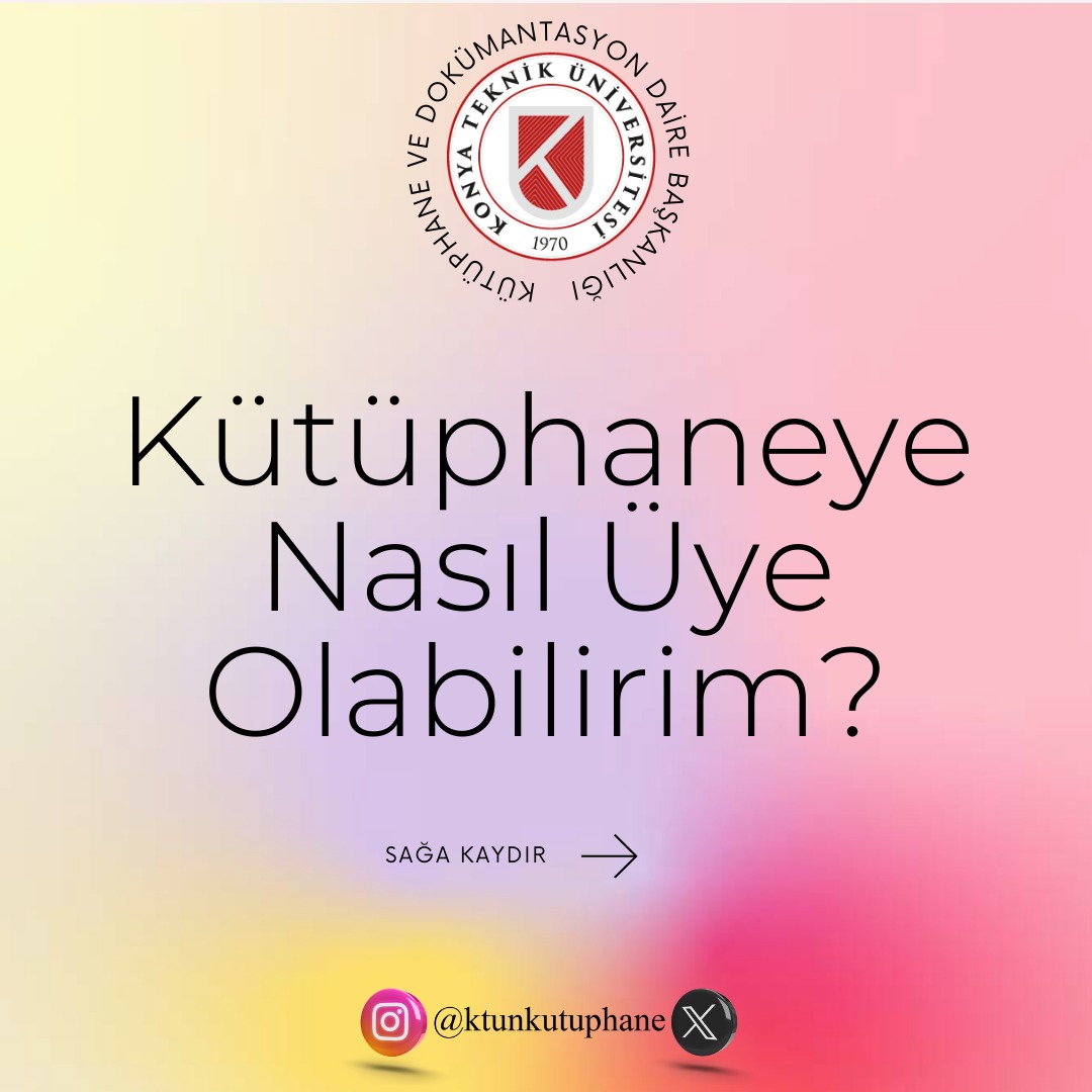 Değerli Kullanıcılarımız; 2020 yılından bu yana Gelişim Yerleşkesinde hizmet veren kütüphanemizin fiziki ve uzaktan hizmetlerinden faydalanabilmek için MUTLAKA ÜYE OLMANIZ GEREKMEKTEDİR. Kütüphaneye üye olma aşamaları aşağıdaki gibidir; kütüphane üye. KTUN