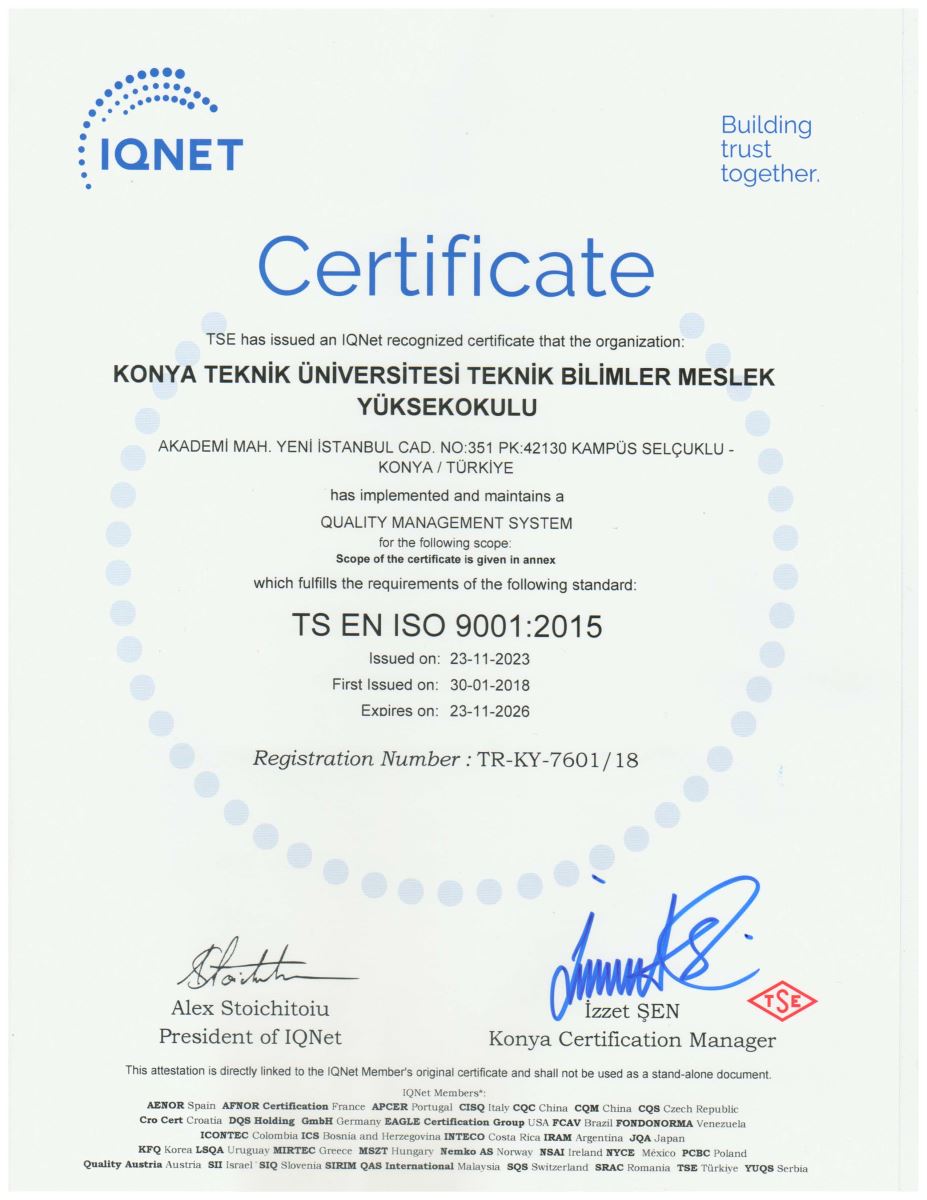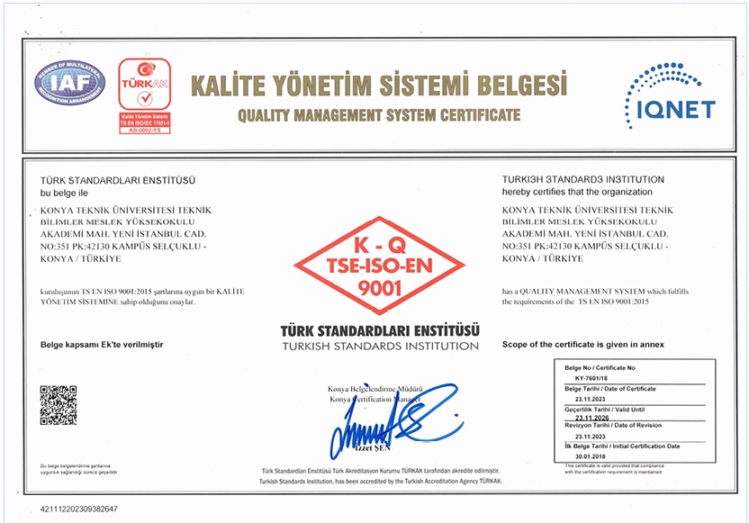 Yüksekokulumuzun eğitimde mükemmellik ve sürekli iyileştirme vizyonunun bir tescili olan TS EN ISO 9001:2015 Kalite Yönetim Sistemi Belgesi, yapılan denetimler sonucunda 2026 yılına kadar yeniden tescil edilmiştir.