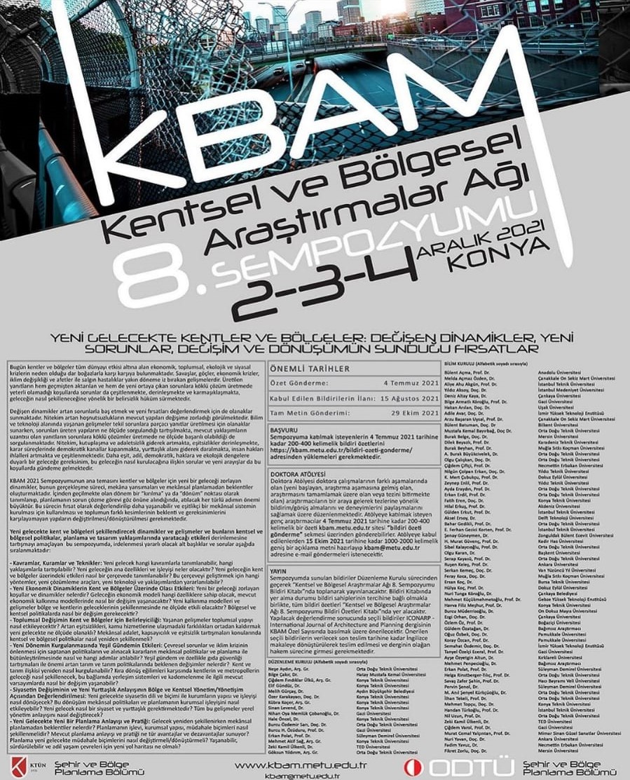 KBAM Kentsel ve Bölgesel Araştırmalar Ağı 8. Sempozyumu 2-3-4- Aralık 2021 tarihleri arasında Konya Teknik Üniversitesi Şehir ve Bölge Planlama Bölümü öncülüğünde online gerçekleştirilecektir.