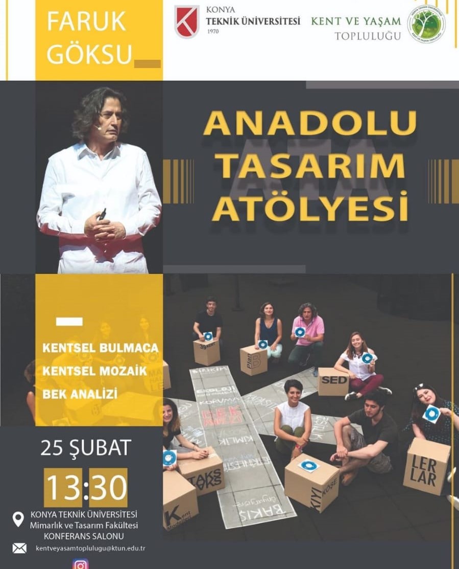 Faruk Göksu'nun yürütücülüğünde Anadolu Tasarım Atölyesi 25.02.2020 tarihinde Konya Teknik Üniversitesi Mimarlık ve Tasarım Fakültesi Konferans salonunda gerçekleştirilecektir.