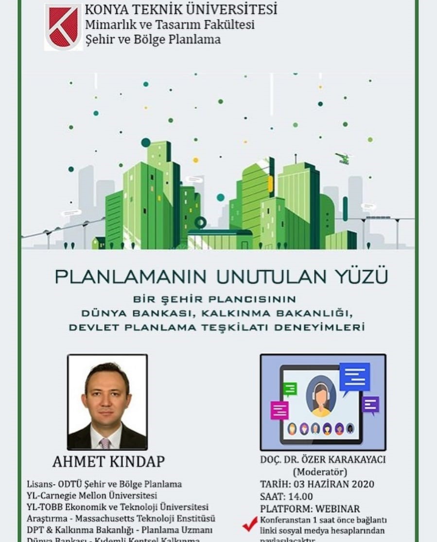 Planlamanın Unutulan Yüzü  konulu söyleşi Şehir Plancısı Ahmet Kındap tarafından 03.06.2020 tarihinde Webinar üzerinden gerçekleştirilecektir.