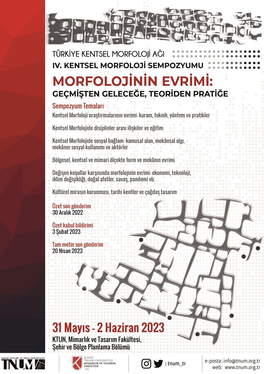 31 Mayıs-1-2 Haziran 2023 tarihlerinde Türkiye Kentsel Morfoloji Ağı tarafından düzenlenecek olan 4. Kentsel Morfoloji Sempozyumu, Konya Teknik Üniversitesi ev sahipliğinde gerçekleştirilecektir. Sempozyum hakkında detaylı bilgi, önemli tarihler ve internet sitesine ulaşmak için görsele tıklayınız.
