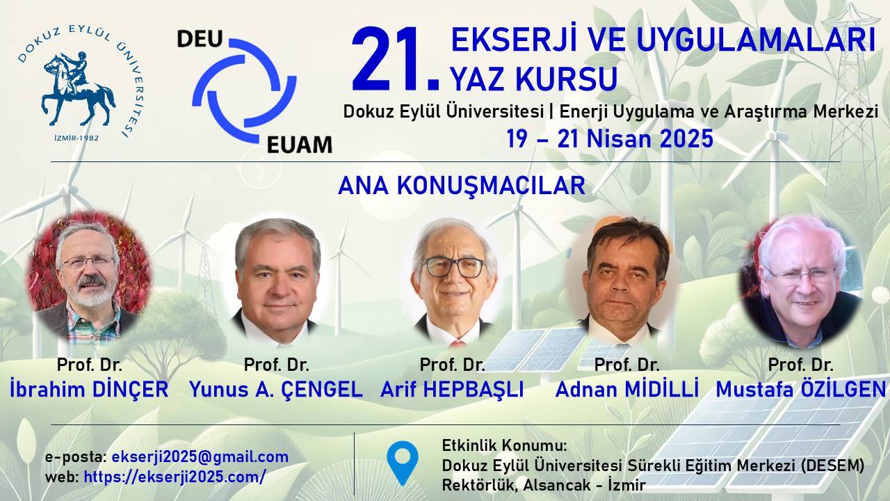 Dokuz Eylül Üniversitesi Enerji Uygulama ve Araştırma Merkezi tarafından 19-21 Nisan 2025 tarihleri arasında 21. Ekserji ve Uygulamaları Yaz Kursu düzenlenecek olup, yaz kursuna ait bilgilere https://www.ekserji2025.com adresinden ulaşılabilmektedir.